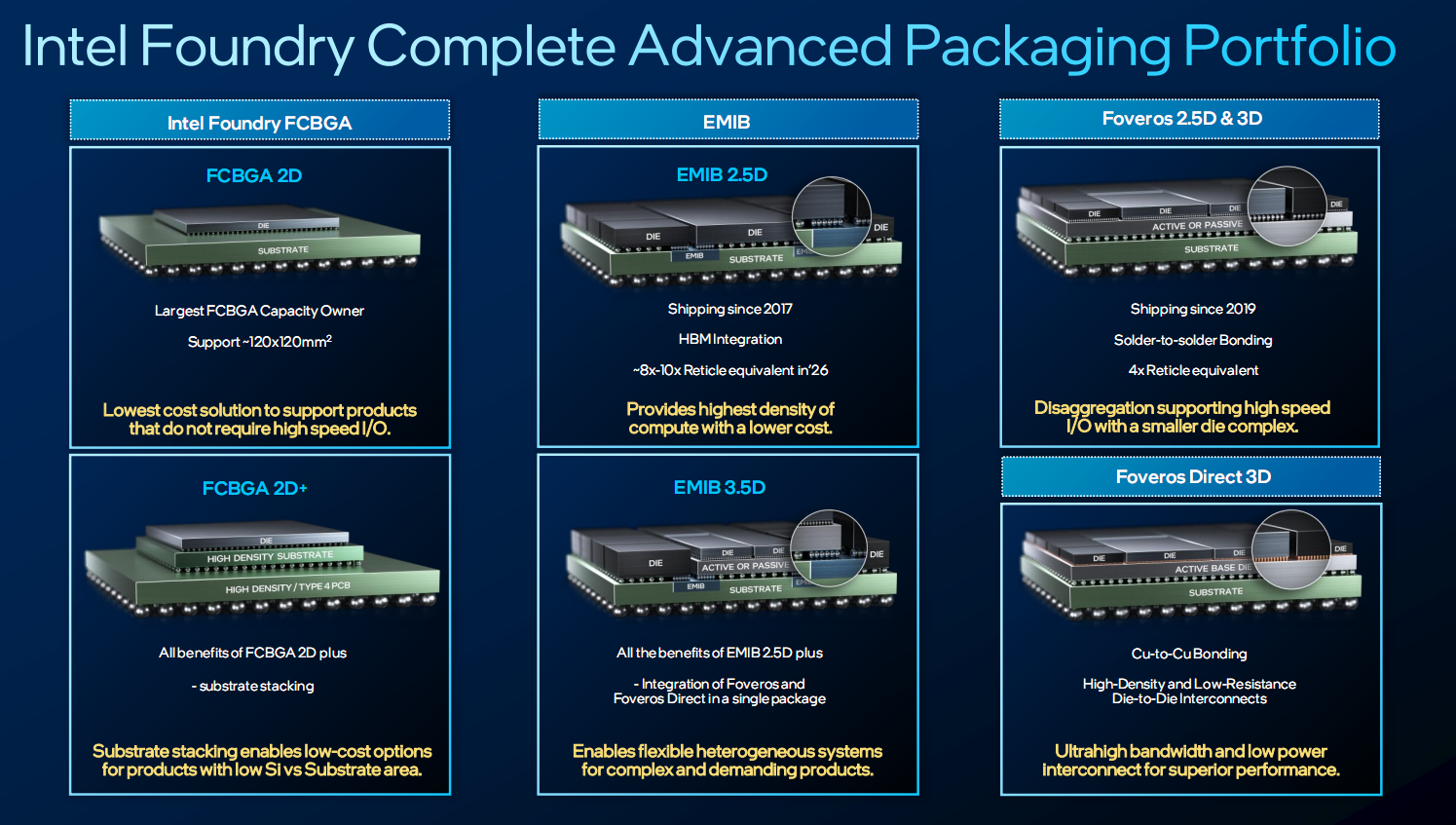 最左边是传统的FCBGA(倒装芯片球栅阵列封装),有两种不同的版本:FCBGA 2D、FCBGA 2D+。