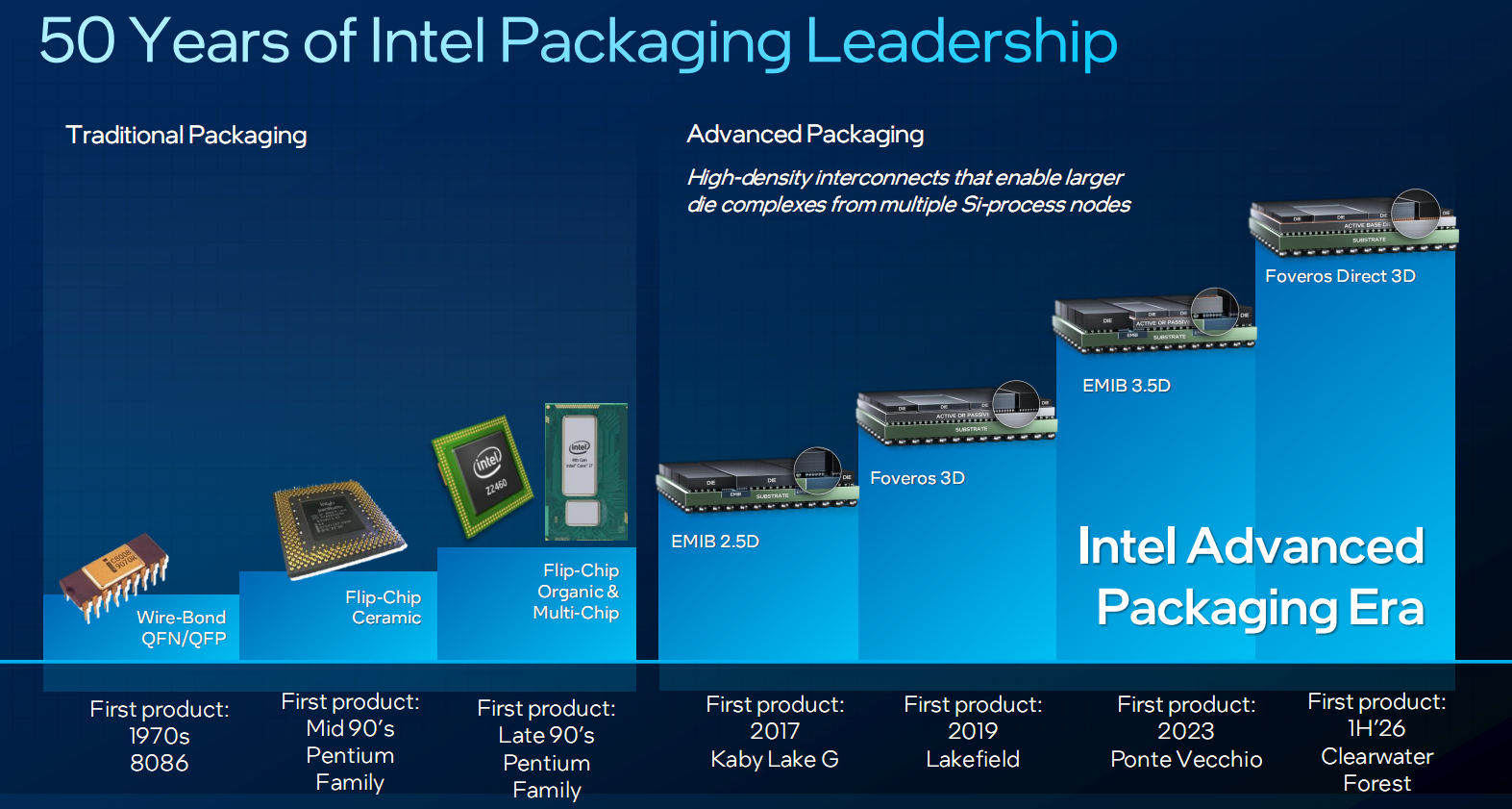 Intel作为半导体行业龙头,半个多世纪以来一直非常重视封装技术,不断推动演化。