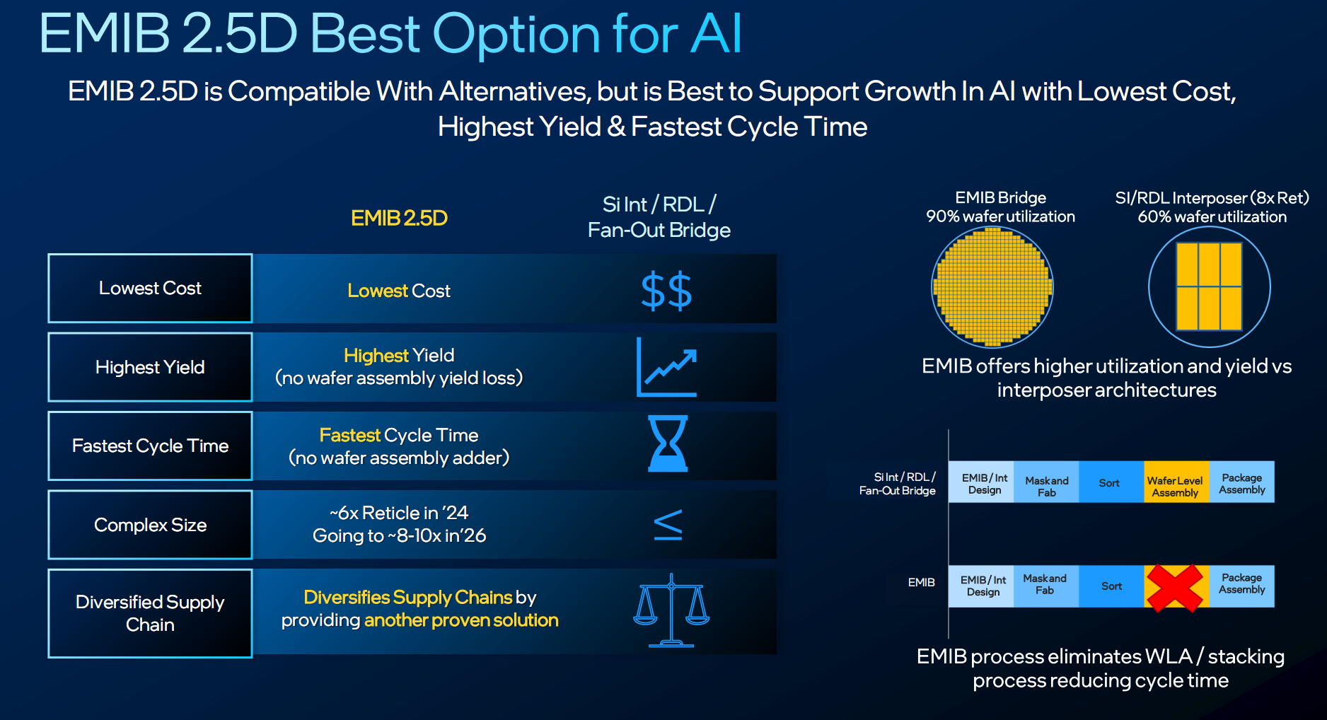 从图中可以看到,EMIB桥接是一种非常小的硅片,可以高效利用晶圆面积,利用率往往超过90%,而其他中介层技术因为是大型封装结构,会造成很大的晶圆面积浪费,利用率可能只有60%左右。
