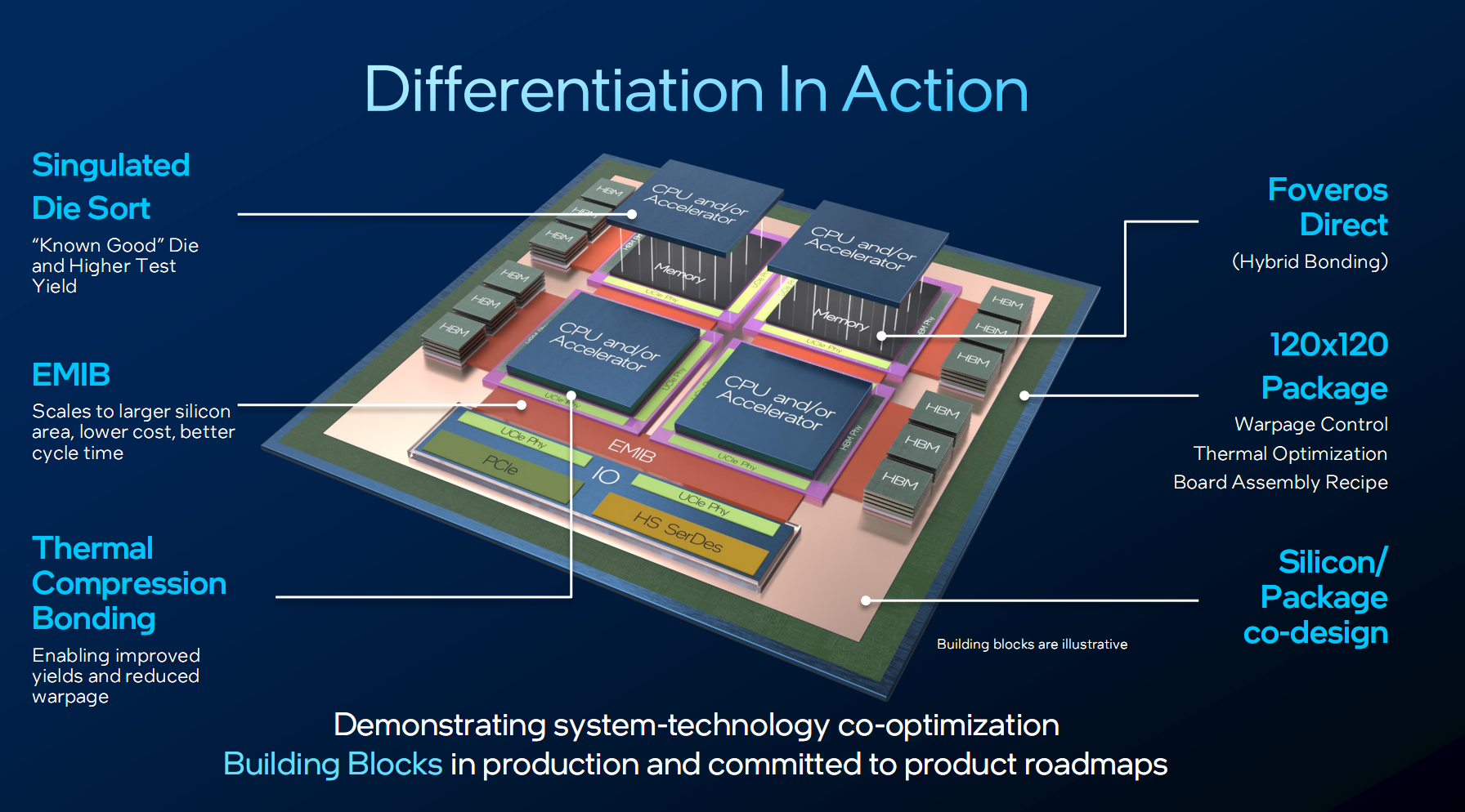 以一颗包含多个不同模块、采用3D堆叠技术的复杂AI加速器为例,看一下Intel的多种封装、测试技术是如何协同工作的。