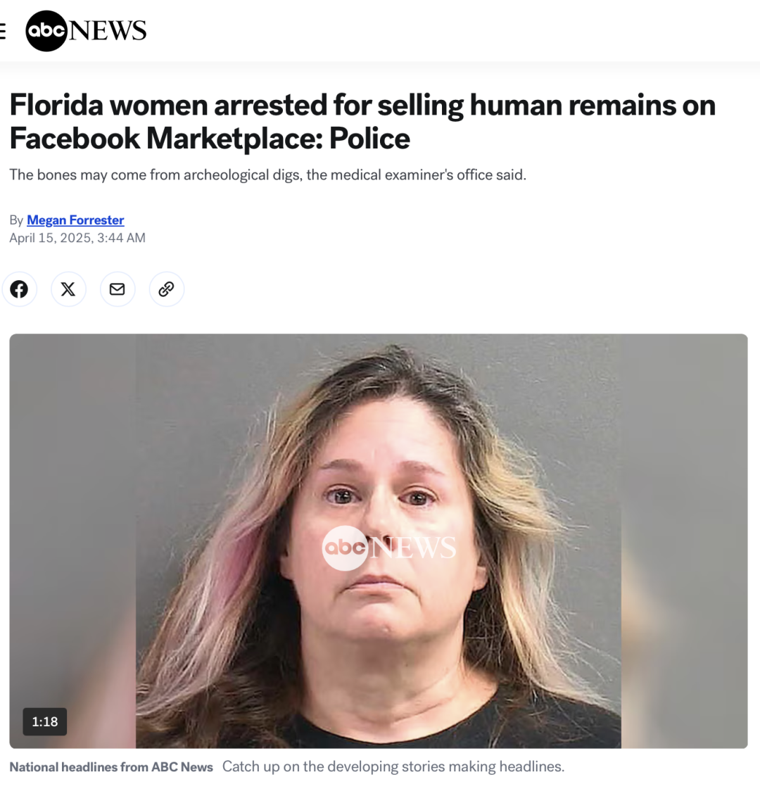 就在 4 月 13 日,据《纽约邮报》报道,一位 52 岁的佛罗里达州妇女在 Facebook Marketplace 上买卖人骨,两个人头骨 90 美元,一个人锁骨和肩胛骨 90 美元,一根人肋骨 35 美元,椎骨 35 美元。