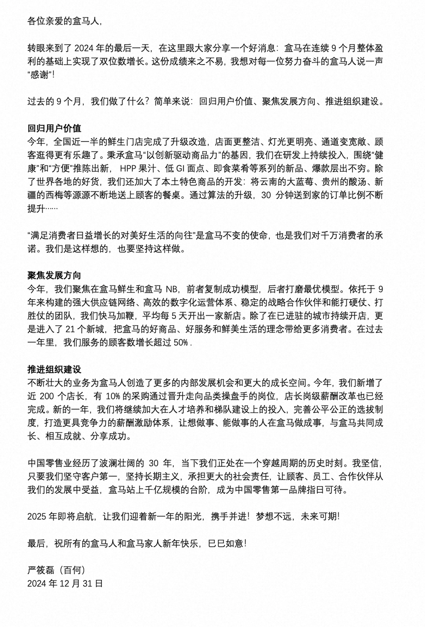 比如去年3-6月,盒马首次实现了淡季连续四个月盈利,年底CEO发全员信的时候,又出现了一个“连续9个月整体盈利”。