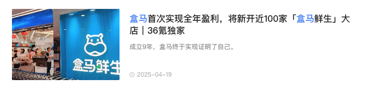 根据36氪的报道,截至 2025 年 3 月,盒马首次实现了全年盈利(2024 年 4 月至 2025 年 3 月)。