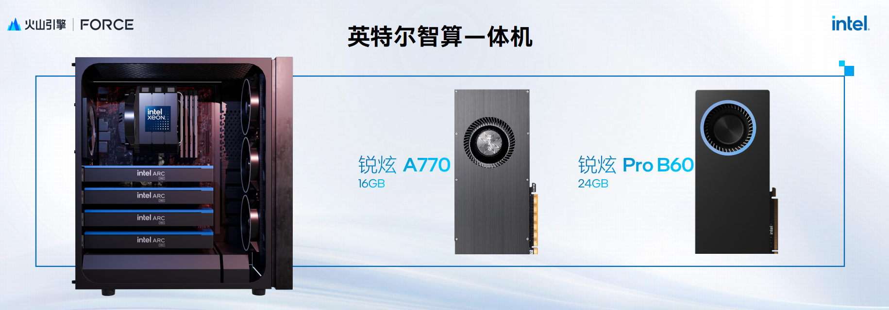 其中,GPU可选早已发布的锐炫A770 16GB,也可选最新发布的锐炫Pro B60 24GB,二者都有大容量显存。