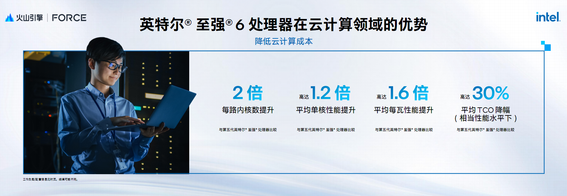 对比五代至强,至强6系列在云计算领域可以实现2倍的核心密度提升、20%的单核性能提升、60%的能耗比提升,最终带来30%的代际TCO成本收益。