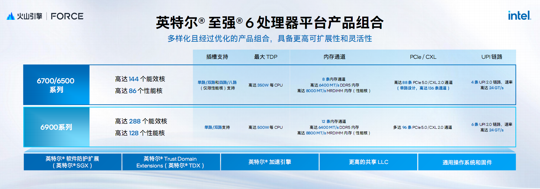 至强6700/6500系列定位主流,可提供最多144个能效核或者86个性能核,支持8个内存通道、88条PCIe 5.0/CXL 2.0通道、6条UPI 2.0链路。