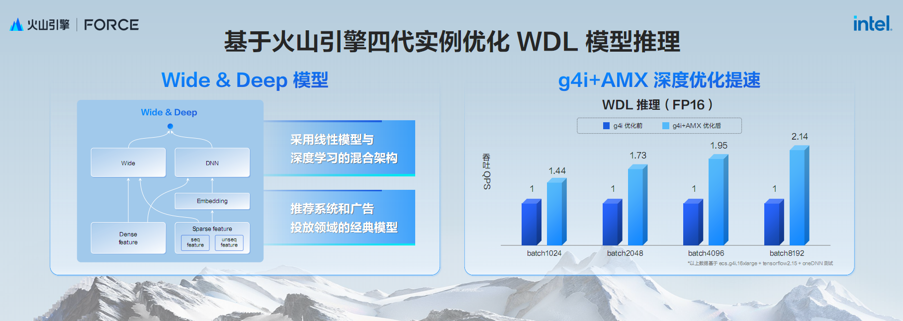 面对这一挑战,火山引擎与Intel进行了深入研究,通过AMX加速器优化,WDL模型推理性能实现了质的飞跃,吞吐能力提升最高达114%,显著提升了模型推理效率。