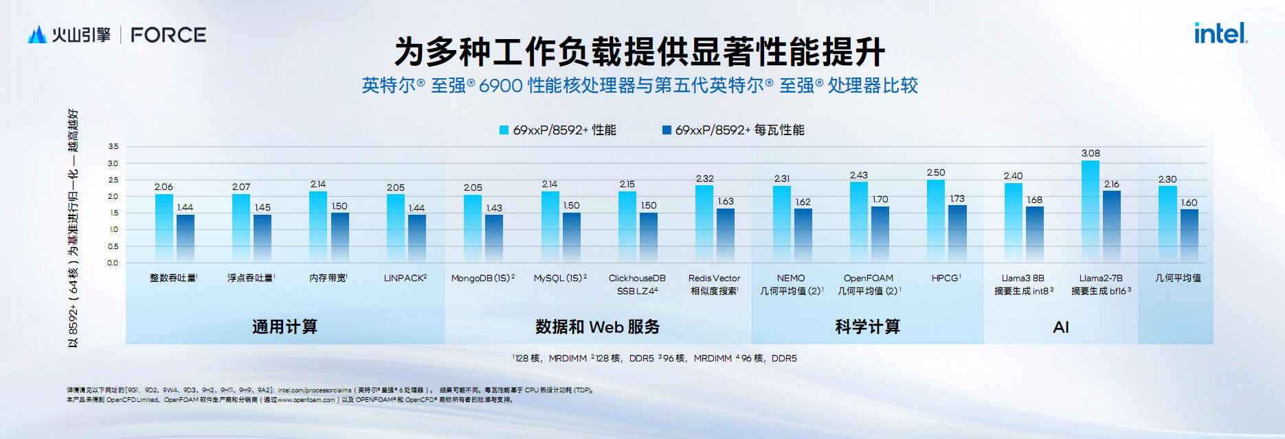 在通用计算、Web服务、科学计算、AI等不同领域,至强6900P系列相比上代至强铂金8592+的性能提升普遍超过2倍,同时每瓦性能普遍提升了1.4倍以上。