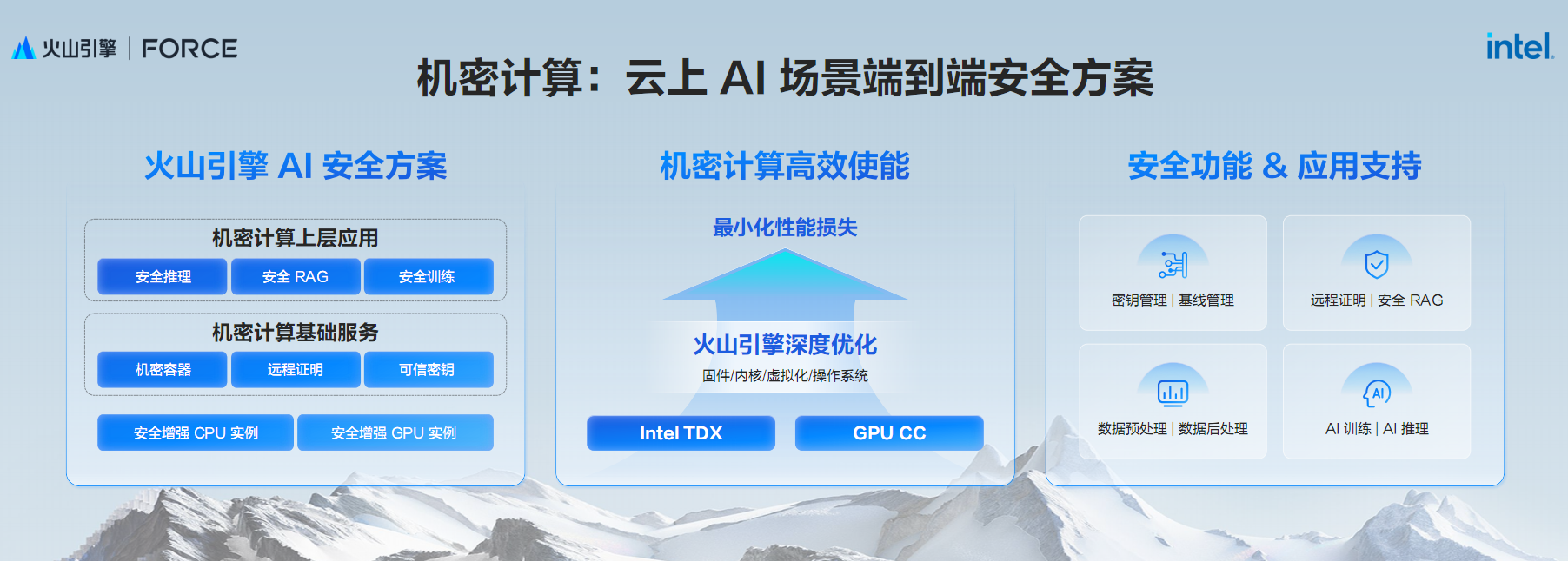 首先,基于CPU TDX和GPU CC硬件机密计算能力,火山引擎在固件、内核、虚拟化、操作系统做了全方位联合深度优化,而且将对性能的影响降至最低。