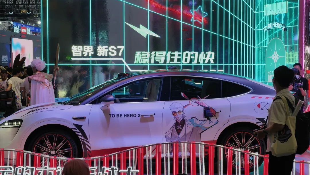 比如领克的都市游乐场,就停了一辆跟即将发售的热门游戏《 明末:渊虚之羽 》联动的定制痛车,智界则是联动了《 凸变英雄 X 》。